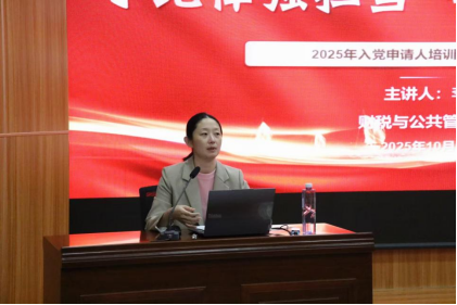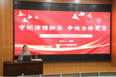 为深入贯彻落实习近平新时代中国特色社会主义思想,深入学习领会党的二十大和二十届二中、三中全会精神,引导入党申请人深刻了解党的纪律、强化责任担当精神,筑牢思想之基,财税与公共管理学院分党校于2025年10月13日开展2025年度入党申请人培训班主题党课第三讲“守纪律强担当争做合格党员”。本次党课由马克思主义学院李君副教授主讲。