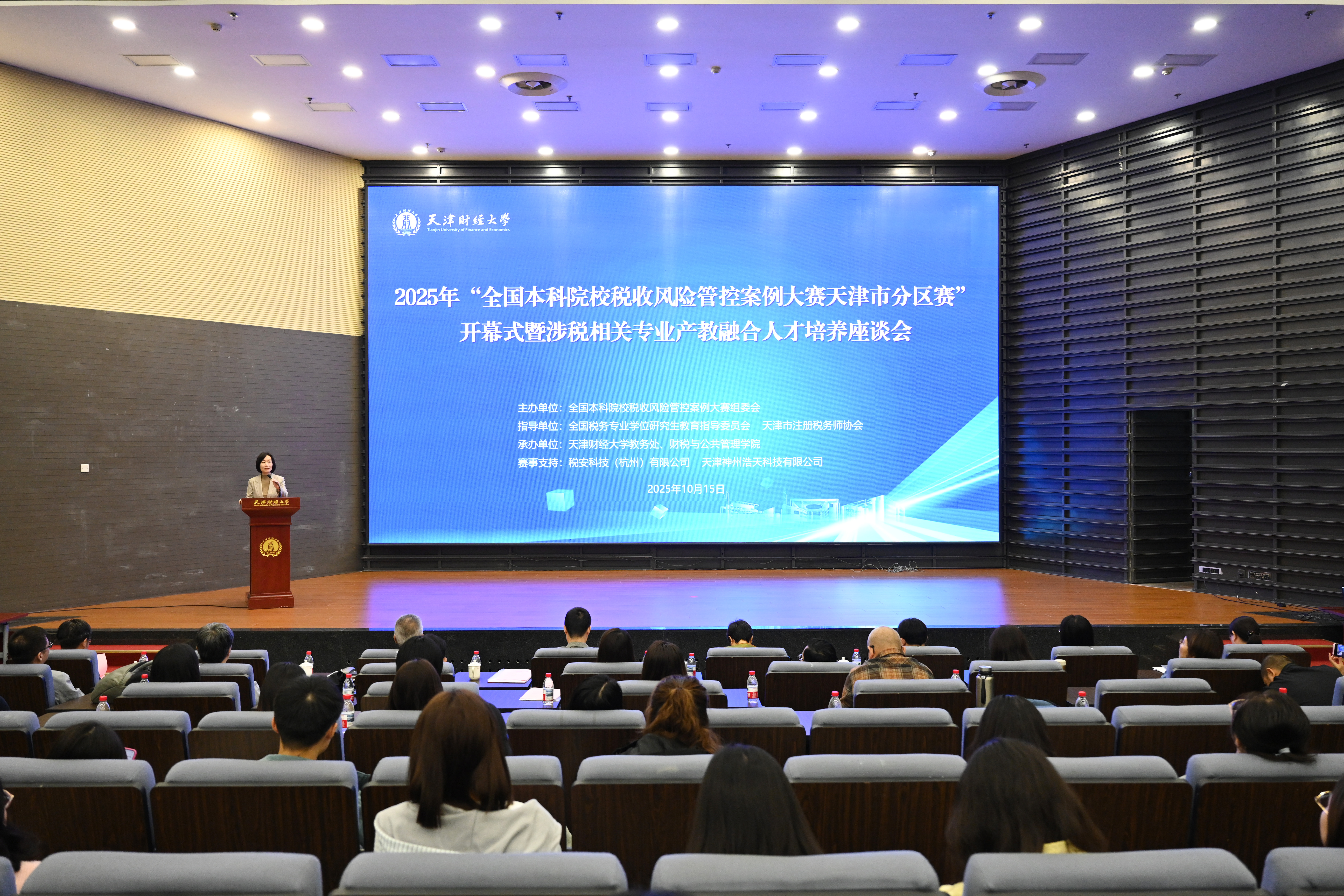 2025年10月15日,全国本科院校税收风险管控案例大赛天津市分区赛开幕式在我校隆重举行。本次大赛由全国本科院校税收风险管控案例大赛组委会主办,全国税务专业学位研究生教育指导委员会、天津市注册税务师协会共同指导,天津财经大学教务处、财税与公共管理学院联合承办,税安科技(杭州)有限公司、天津神州浩天科技有限公司提供赛事支持。我校党委副书记陈连胜、天津市注册税务师协会会长高秋丰、全国税收风险管控案例大赛组委会代表黄冠豪等嘉宾出席大赛开幕式。开幕式同时还邀请到我市多家5A级税务师事务所的所长或执行董事,以及来自南开大学、天津科技大学、天津城建大学、天津商业大学、天津农学院、天津仁爱学院、天津财经大学珠江学院等兄弟院校的带队领导、指导教师以及参赛学生代表,共计一百余人参加。大赛开幕式由财税与公共管理学院院长张平教授主持。