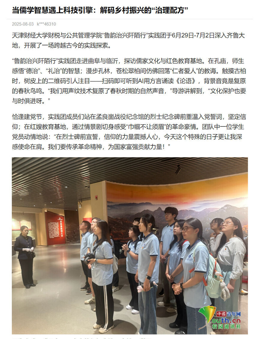 近日,中国青年网对我院“鲁韵治兴阡陌行”实践团在齐鲁大地开展的三下乡社会实践活动进行了报道,此次社会实践以儒学智慧为魂、科技引擎为翼,在古今对话中解码乡村振兴的“治理配方”,将课堂延伸至田野乡间与企业车间,是我院推动科教融合、服务基层发展的生动实践。