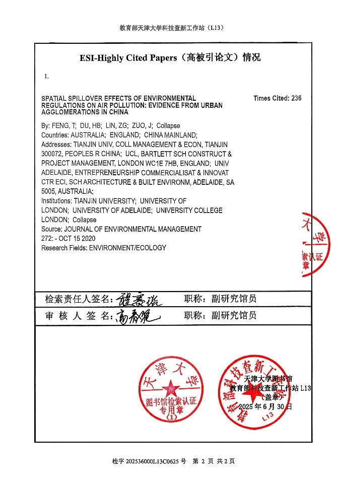 此外,我院冯彤副教授发表于Journal of Environmental Management的论文Spatial spillover effects of environmental regulations on air pollution: Evidence from urban agglomerations in China入选ESI(基本科学指标)全球高被引论文。ESI数据库基于近十年全球科研论文的引用数据,将各学科领域内引用次数排名前1%的论文评定为“高被引论文”。该遴选机制表明本论文在其环境科学领域的影响力已位居国际同期成果的最前列,体现了重要的国际学术影响力。
