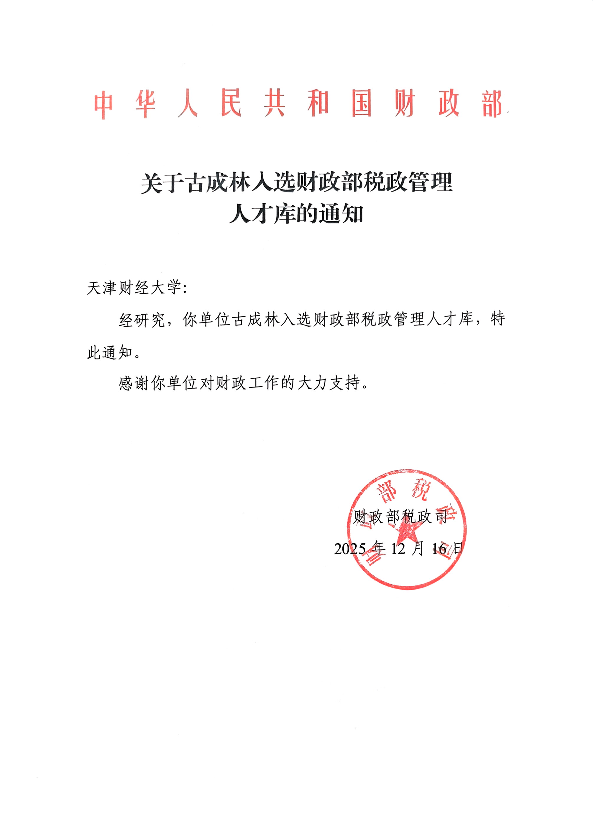 一直以来,我院高度重视学科人才培养工作,积极为师生发展搭建优质平台。此次古成林博士入选财政部税政管理人才库,是我院创新人才培养机制,落实校党委“新财经”建设实施纲要,推进学院学科建设的重要成果。