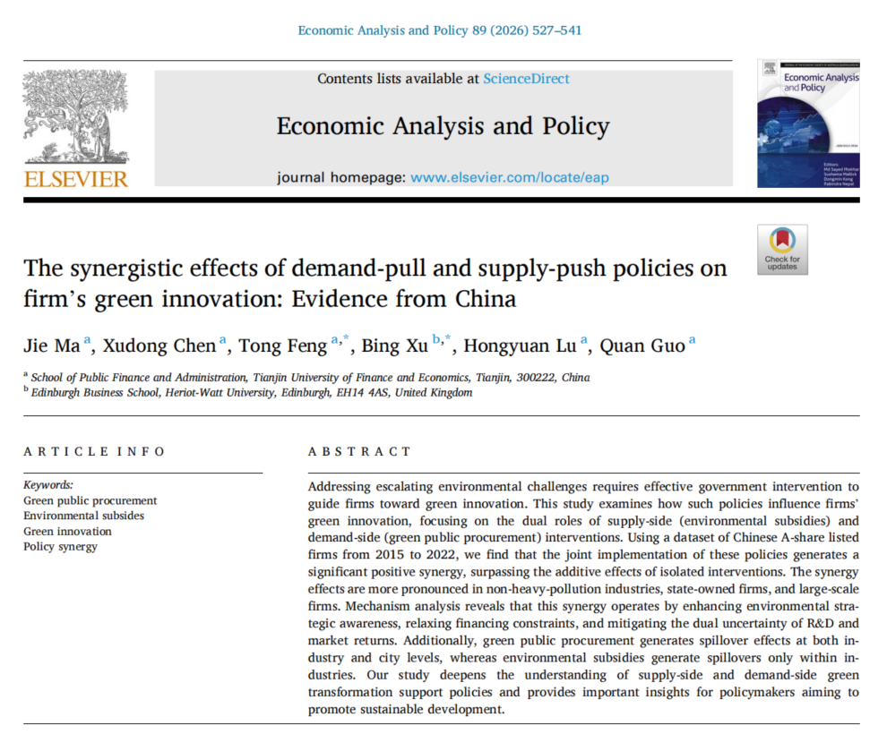 近日,我院2023级财政学专业博士生马婕(导师:陈旭东教授,副导师:冯彤副教授)作为第一作者,与其导师陈旭东教授、副导师冯彤教授、英国赫瑞瓦特大学徐冰教授、我院青年教师鹿洪源和对外经济贸易大学博士生郭权完成的学术论文《The synergistic effects of demand-pull and supply-push policies on firm’s green innovation:Evidence from China》在国际知名期刊《Economic Analysis and Policy》上正式发表。《Economic Analysis and Policy》专注经济政策分析与评估、经济建模、经济调查研究等领域,是被SSCI收录的JCR一区、中科院2区TOP期刊、我校B1类期刊,引用指数13.9,影响因子8.7。