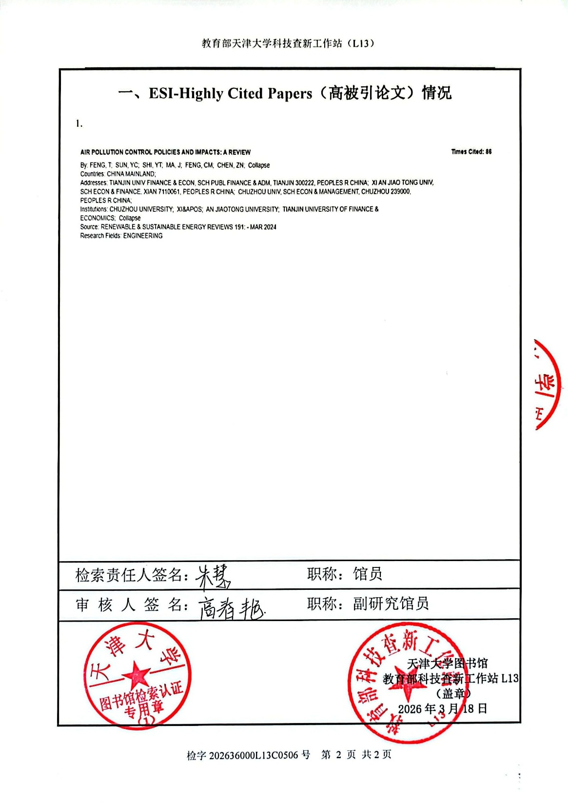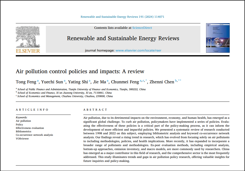 近日,国际权威学术评价机构科睿唯安(Clarivate)发布的最新ESI(Essential Science Indicators)数据显示,我院冯彤副教授作为第一作者,与研究生孙月池、石雅婷、马婕、冯春梅以及西安交通大学陈甄妮副教授合作发表的论文“Air pollution control policies and impacts: A review”成功入选2025年ESI高被引论文,该论文于2024年发表在可再生和可持续能源领域顶级期刊《Renewable and Sustainable Energy Reviews》(RSER)上。该期刊聚焦可再生能源与可持续能源的综述、系统分析、政策与技术经济评估,是中国科学院工程技术一区Top期刊,影响因子16.3。