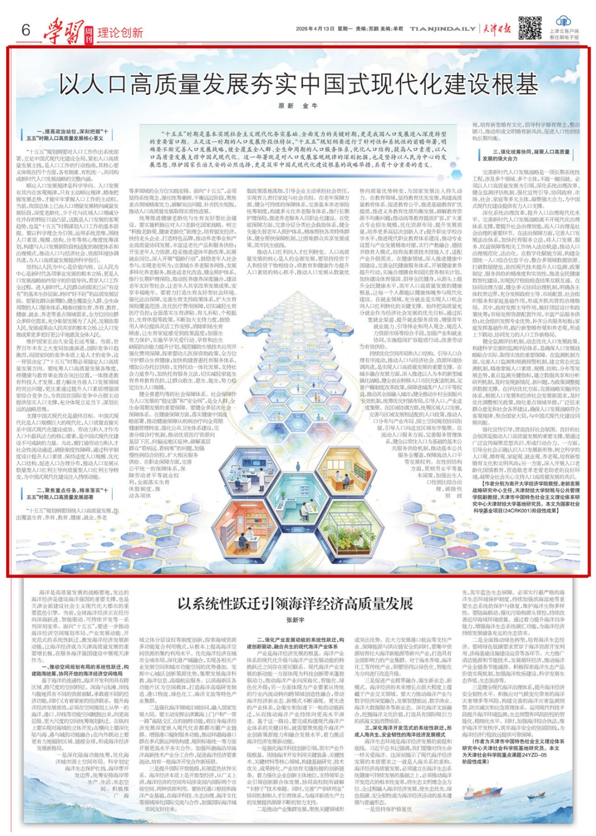 2026年4月13日,《天津日报》“学习周刊×理论创新”头条刊发我院金牛副教授合作的理论文章《以人口高质量发展夯实中国式现代化建设根基》,文章篇幅在4500字左右,津云平台同步发布。该文章是金牛副教授主持的国家社科基金“基于人口高质量发展的多维人口红利转变研究”(24CRK001)的阶段性成果。
