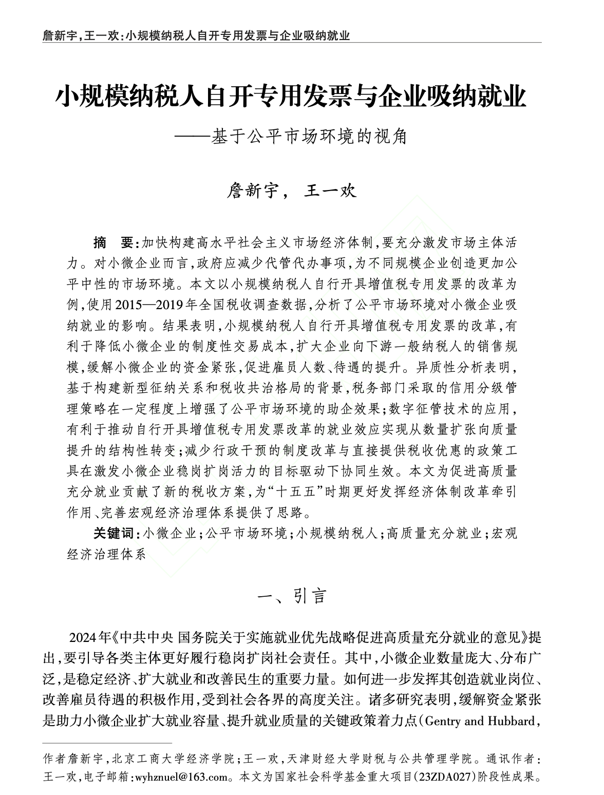 合作者包括北京工商大学詹新宇教授。论文以小规模纳税人自行开具增值税专用发票的改革为例,分析了公平市场环境对小微企业吸纳就业的影响。结果表明,小规模纳税人自行开具增值税专用发票的改革,有利于降低小微企业的制度性交易成本,扩大企业向下游一般纳税人的销售规模,缓解小微企业的资金紧张,促进雇员人数、待遇的提升。异质性分析表明,基于构建新型征纳关系和税收共治格局的背景,税务部门采取的信用分级管理策略在一定程度上增强了公平市场环境的助企效果;数字征管技术的应用,有利于推动自行开具增值税专用发票改革的就业效应实现从数量扩张向质量提升的结构性转变;减少行政干预的制度改革与直接提供税收优惠的政策工具在激发小微企业稳岗扩岗活力的目标驱动下协同生效。论文为促进高质量充分就业贡献了新的税收方案,为“十五五”时期更好发挥经济体制改革牵引作用、完善宏观经济治理体系提供了思路。