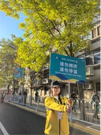 在2025年天津马拉松志愿服务中,我负责半程马拉松起点内场的秩序维护工作。赛前整理转发各项通知、分发志愿者物资,全力做好志愿服务前期的筹备工作;赛场中耐心引导跑者有序排队、提醒大家切勿在跑道上拥挤停留,全力保障起点秩序顺畅。