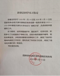 感想:今年寒假,我在天津市津南区税务局第一税务所实习。这段经历虽短暂,却让我对基层纳税服务工作有了更真切的认识和感悟。从最初面对纳税人询问时的紧张无措,到后来能够独立处理多项业务,我在挑战中快速成长。实习中,我不仅掌握了发票核验、人脸识别验证、“首违不罚”政策应用等操作技能,更深刻体会到税务工作“耐心”与“温度”的重要性。